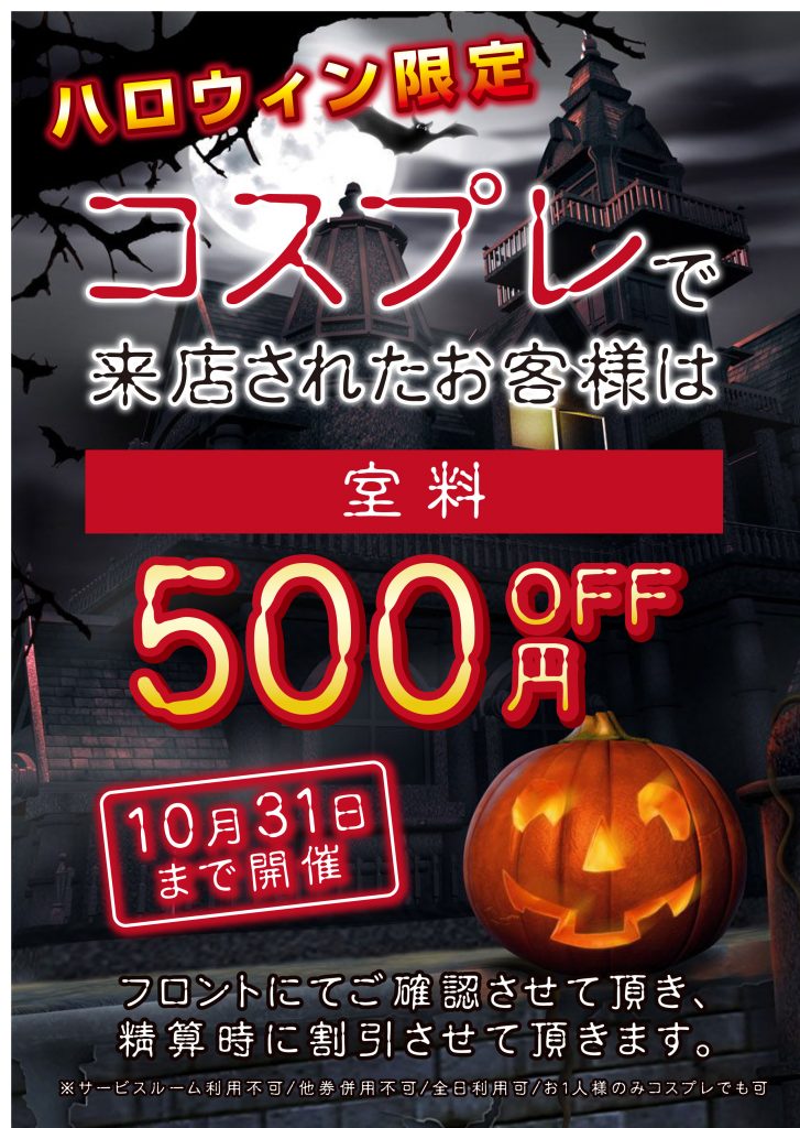 10月31日までの限定イベント★コスプレで来店されたお客様には室料500円OFF!